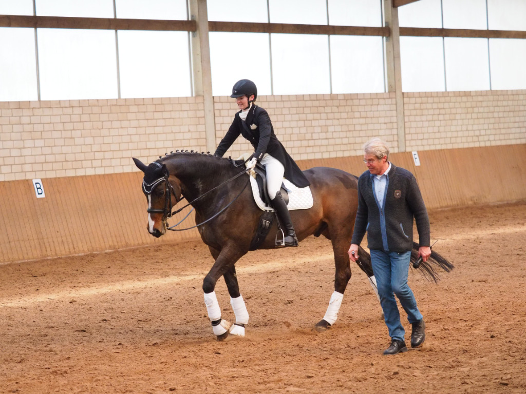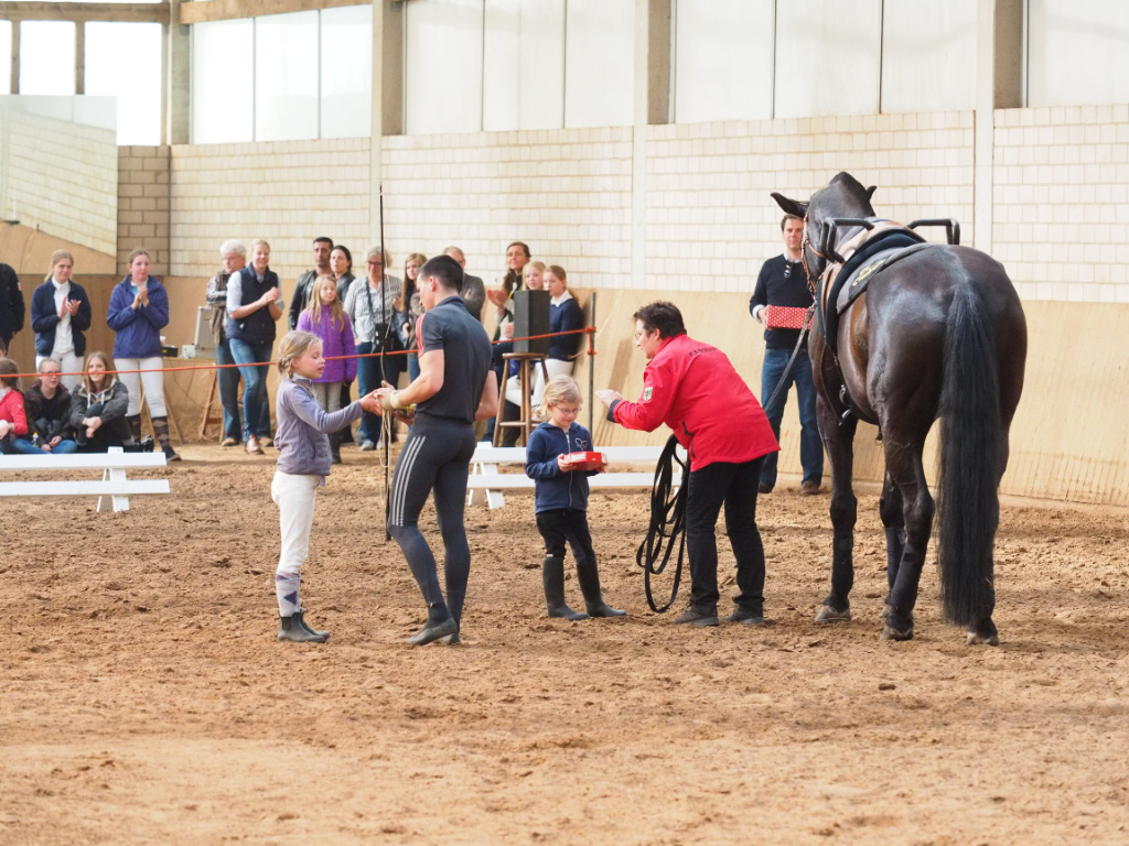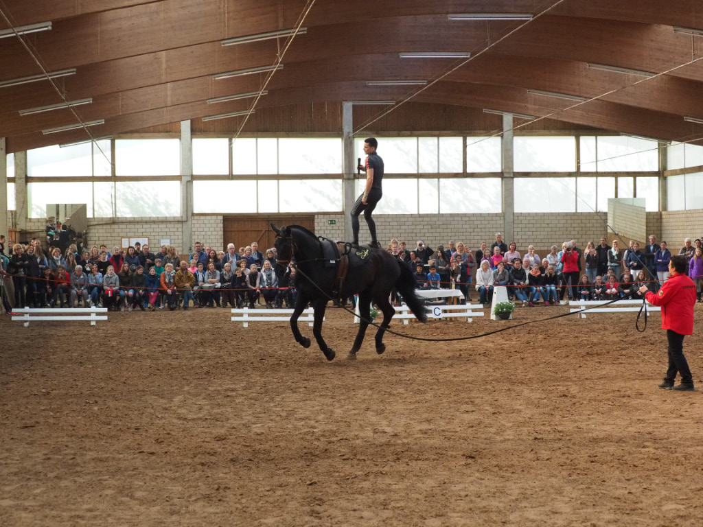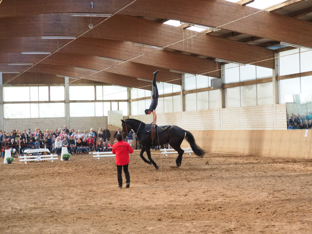 Aber dabei sollte es nicht bleiben: weitere Höhepunkte waren die Vorführung einer M-Kür von unserer Auszubildenden Anki mit ihrem Wallach Presley, die Zirkuslektionen und Bodenarbeitselement, die uns Joline gezeigt hat und natürlich die Präsentation von Jannis und Simone Drewell mit ihrem Nachwuchspferd Ricciano. Es hatte schon wirklich weltmeisterliche Klasse, auf dem galoppierenden Pferd stehend, den Zuschauer übers Mikro zu erklären, was man eigentlich gerade tut.